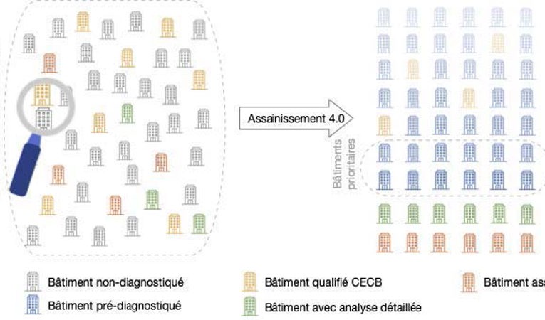Chaque année, plusieurs milliards sont investis dans l’amélioration des performances énergétiques et structurelles du bâti existant, et ce montant devrait augmenter à l’avenir. Lorsqu’un bâtiment doit être assaini, les spécialistes identifient les meilleures stratégies de rénovation, basées sur des études poussées et coûteuses. Les objectifs 2050 fixés par la Confédération pour la performance énergétique du bâti suisse devenant de plus en plus contraignants, des plans stratégiques d’intervention à large échelle doivent être établis sur la base d’une classification des bâtiments selon leur potentiel d’amélioration.