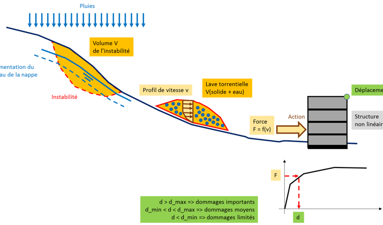 - propagation de la lave torrentielle le long de la pente, grâce à un second modèle tenant compte du couplage hydromécanique et détermination fine de la force d'impact sur le bâtiment menacé