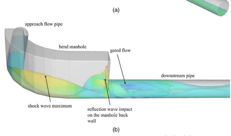 Hydraulic design of variable bend manhole geometries with supercritical flow based on hydrodynamic simulations.