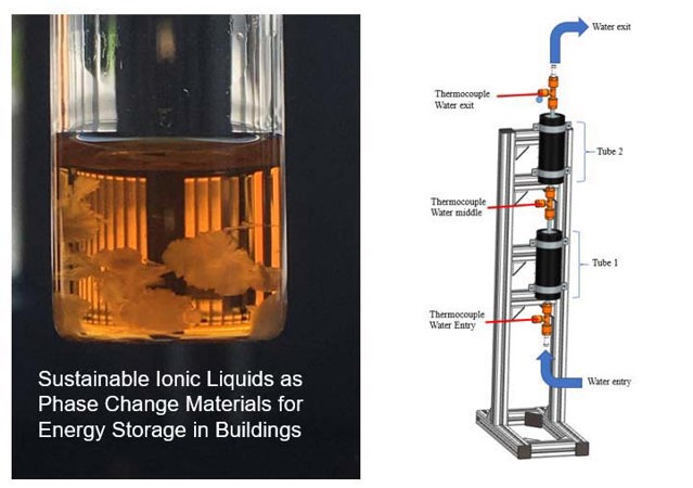 In this project, Prof. Roger Marti and his team prepared novel sustainable phase change materials (PCM) based on ionic liquids (IL) from natural & renewable sources. ILs are organic salts with melting temperature typically below 100 °C. The advantage of ILs is the endless number of cation/anion combinations that allows synthesizing IL for specific applications. The team from ChemTech and ENERGY also developed a lab-scale prototype for testing and characterization of these ILs. Our newly developed ionic liquids are more efficient at absorbing energy than the common commercial PCM. This is some promising insight into the use of ionic liquids in the application of energy storage.
