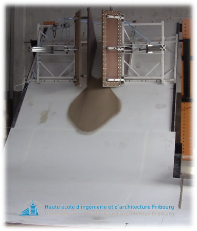 The research will be performed on a large physical model (4 x 6 m in size) allowing the release of dry granular materials on a slope ending with a horizontal accumulation area. Several testing parameters can be varied: material used (gravel, small bricks), release height, volume and release sequence (at once or at different times), inclination of the slope, surface roughness and morphology of the transition between the panels (sharp angular or curved). The foreseen experimental study will focus on assessing the influence of the initial geometry of the mass at start (width, height, inclination of the basal plane) on the propagation, lateral spreading and runout distance. It will take advantage of recent improvements to the releasing device and the measurement system. The former consists of a wood container with variable width and height and with a basal plane that can be inclined with respect to the dip angle of the slope below. The latter consists of two synchronised high-resolution and high-speed cameras to allow a stereoscopic reconstruction of the mass morphology during the whole motion. In addition to the experiments, numerical modelling will help to understand the mechanisms of propagation, the loss of energy and the transfer of momentum along the path.