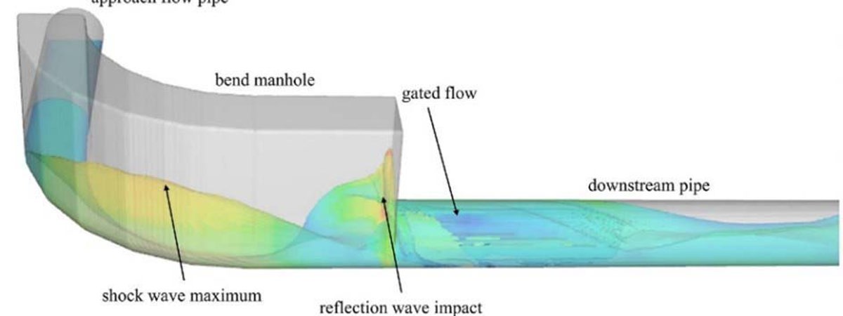 Les regards coudés sont fréquents dans les réseaux d’assainissement. La déviation d’un écoulement torrentiel génère des ondes, frappant l'extrémité du regard et générant une mise en charge. Des simulations hydrodynamiques sont effectuées pour évaluer le fonctionnement hydraulique. La simulation a été validé avec des données provenant de tests sur modèles réduits. Les simulations numériques ont permis de montrer que la capacité hydraulique était améliorée pour des rayons de courbure accrus et avec un regard prolongé en aval, alors que l'effet de l'angle de déviation est moins significatif.