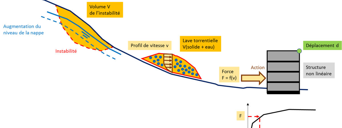 - propagation de la lave torrentielle le long de la pente, grâce à un second modèle tenant compte du couplage hydromécanique et détermination fine de la force d'impact sur le bâtiment menacé