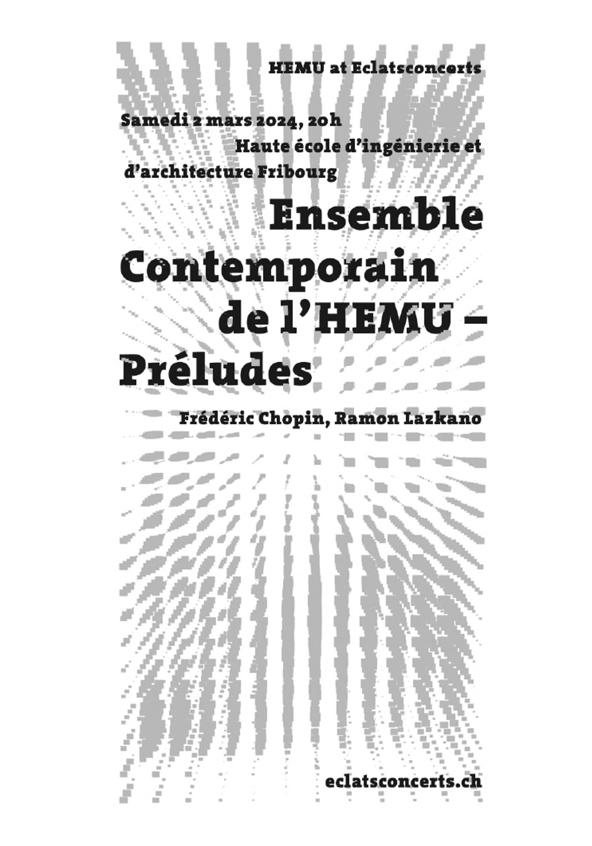 Pour ce projet, Ramon Lazkano a été invité à ressaisir des préludes pour piano de Chopin et à composer une série de courts préludes pour un ensemble de huit musiciens. Sur scène, divisée en deux espaces distincts, le soliste répondra aux instrumentistes de l'Ensemble Contemporain, comme si la musique d'aujourd'hui répondait à celle du passé. Miroirs antagonistes se nourrissant pourtant l’un de l’autre, la mise en regard des œuvres de Chopin et de Lazkano permettra l’avènement d’un univers altéré, hétérogène, un balancement entre réalités passées et présentes.