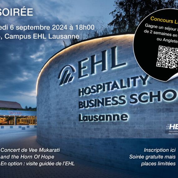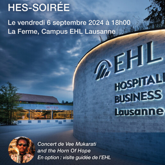 L'EHL nous accueille sur son campus à Lausanne (Chalet-à-Gobet) dans son Montreux Jazz Café "La Ferme" pour une HES-Soirée en musique avec le concert de The Horne Of Hope de Vee Mukarati. Le saxophoniste et chanteur originaire du Zimbabwe et son groupe vont nous faire vibrer sur des notes afro-jazz et soul tout au long de la soirée! Les invités pourront se régaler avec l'apéritif dinatoire préparé par les chefs de l'EHL. Cette soirée est aussi une opportunité unique de visiter le campus EHL à renomée internationale. Des visites guidées sont proposées avant la partie officielle.