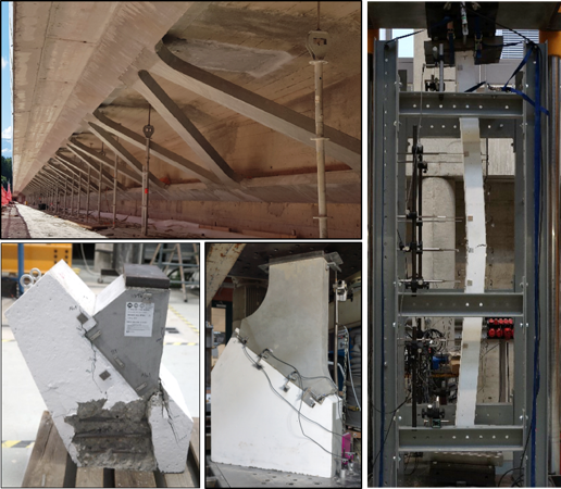 Dans ce contexte, le laboratoire de structures de la Haute école d'ingénierie et d'architecture de Fribourg a été mandaté pour réaliser une série d'essais de laboratoire dans le but d'évaluer le comportement mécanique et la résistance des béquilles en BFUP ainsi que des détails de connexion entre les béquilles et la structure existante.