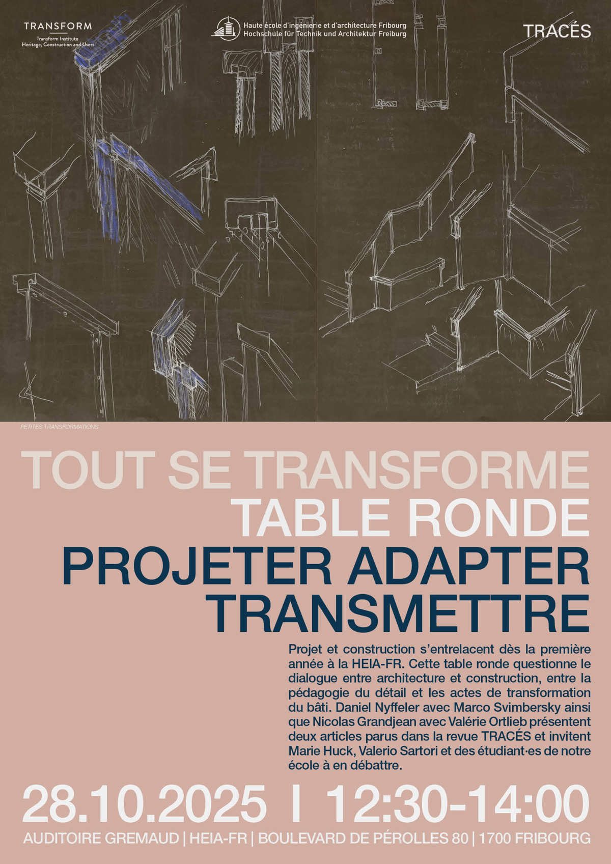 Dans le cadre du projet Tout se transforme, l’Institut TRANSFORM, la filière d’architecture de la HEIA-FR, la revue TRACÉS et le Smart Living Lab organisent leur prochaine Table ronde :
